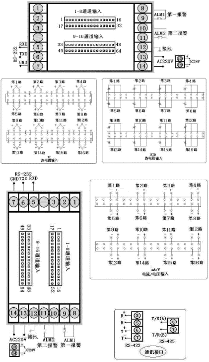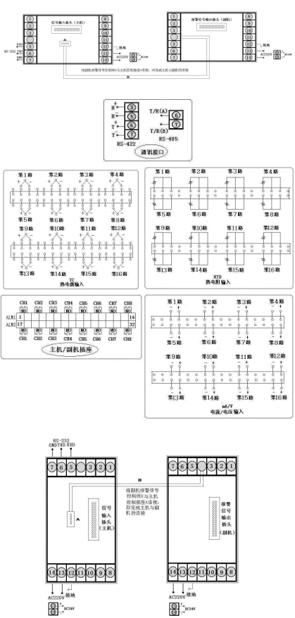 c .分別控制/報警輸出:即儀表各測量通道均有一個(或兩個)報警繼電器輸出報警,報警輸出互相獨立?;蚋鳒y量通道均有一組相互獨立的變送控制輸出。當輸入通道≤8時,可選擇分別帶上下限/路報警輸出,當輸入通道>8、≤16時,可選擇上限或下限/路報警輸出。