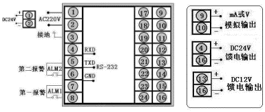 輸出方式 | 01234567 | 無控制輸出繼電器觸點(diǎn)電流 4~20mA電流 0~10mA電壓 1~5V電壓 0~5VSCR-過零觸發(fā)脈沖SSR-固態(tài)繼電器 | |||||||||